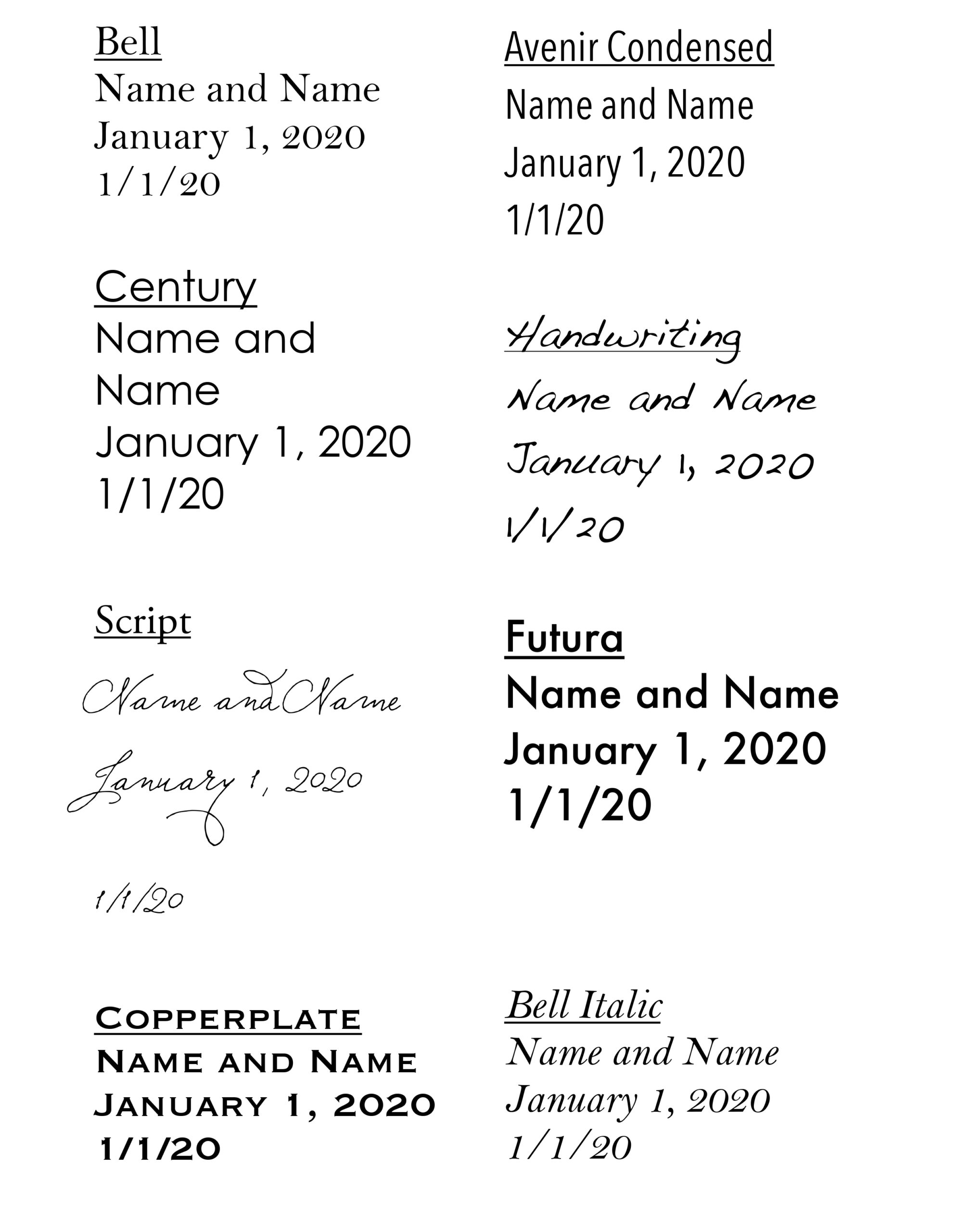 Here are the fonts for the opening page inside of your album (this is not the outside cover imprinting font, see next question for this):