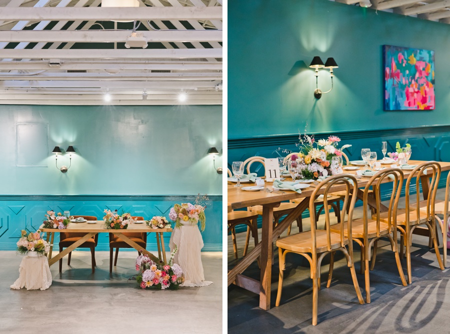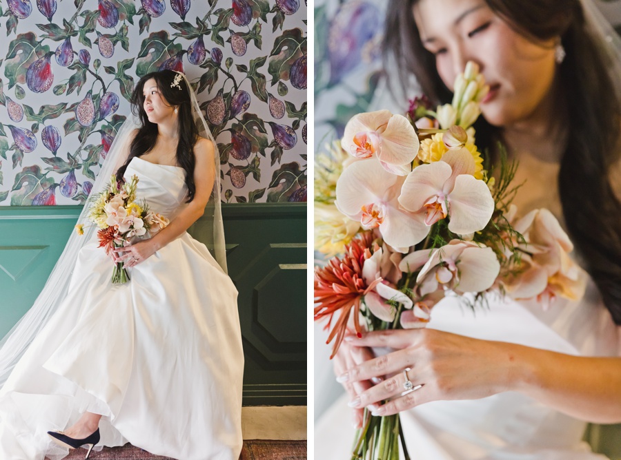 The Fig House already brings the personality with bold colors, jewel tones, and funky furniture. These two leaned right into that. “I wanted my florals and decor to match the colors and furniture accents at The Fig House,” the bride shared. “I told my florist that I’d like the florals to feature bursts of color, and the decor we used leaned into the vibe of the venue.”