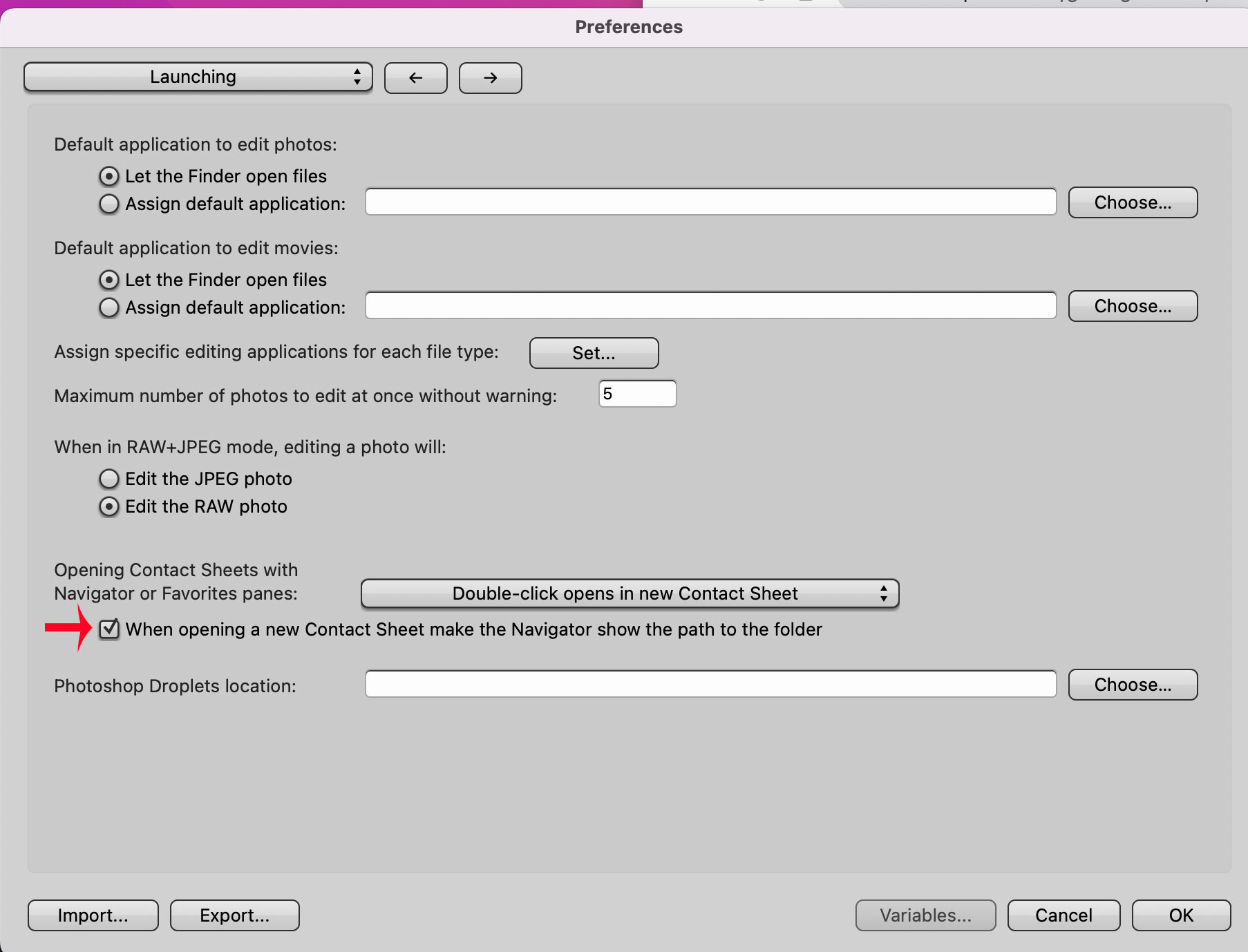 When you start Photo Mechanic, just click its icon in the Dock and don’t open any contact sheets yet. Read these instructions to connect your Lightroom color classes to PhotoMechanic Next go to the Launching preference page and check the box “When opening a new Contact Sheet make the Navigator show the path to the folder”
