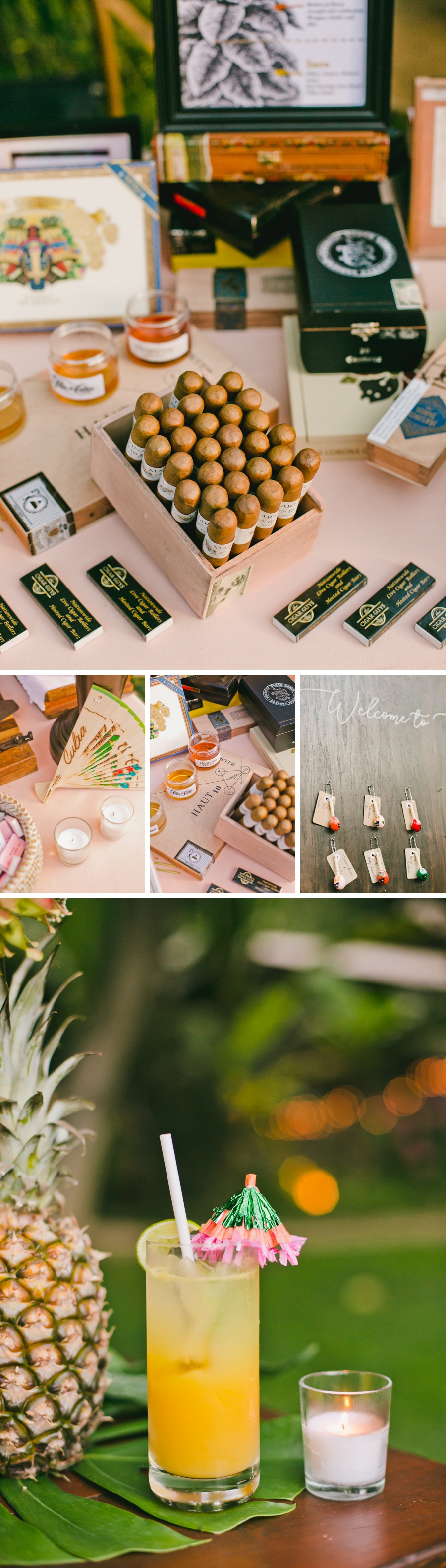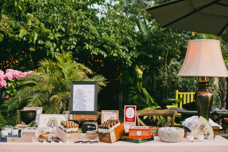 “Rob once gave me a necklace with a pineapple on it and the pineapple quickly became a symbol the two of us loved. When we started to plan our Havana Nights-themed rehearsal dinner we learned that the pineapple symbolizes warmth, welcome and friendship – things that most of us appreciate in a home and would want to experience as a guest at a wedding. The fruit is a symbol of welcome so naturally we displayed them as the centerpiece on every farm table.”